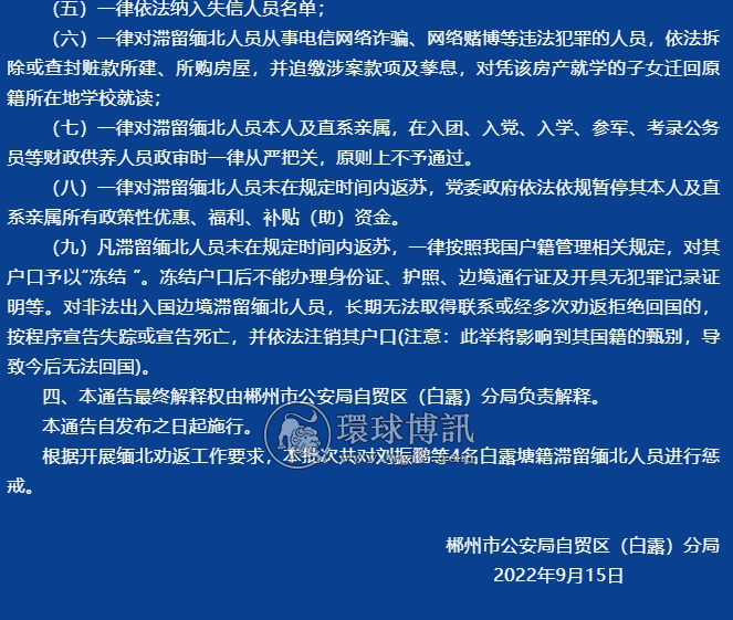 郴州市公安局自贸区(白露)分局对滞留缅北人员采取惩戒措施的通告(第2期) |